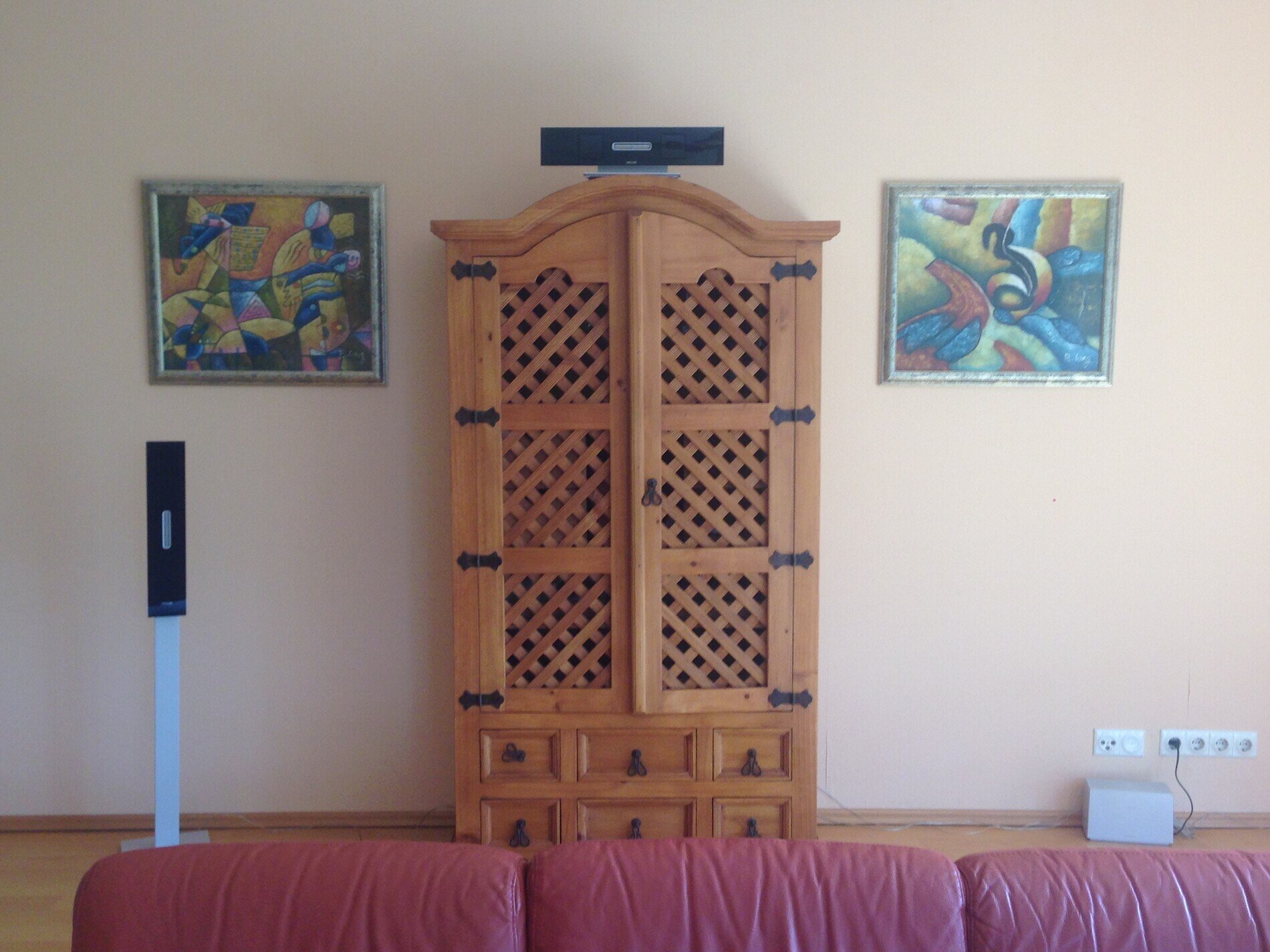- Weinschrank aus mexikanischer Palomino-Pinie sowie rotes Leder-L-Sofa